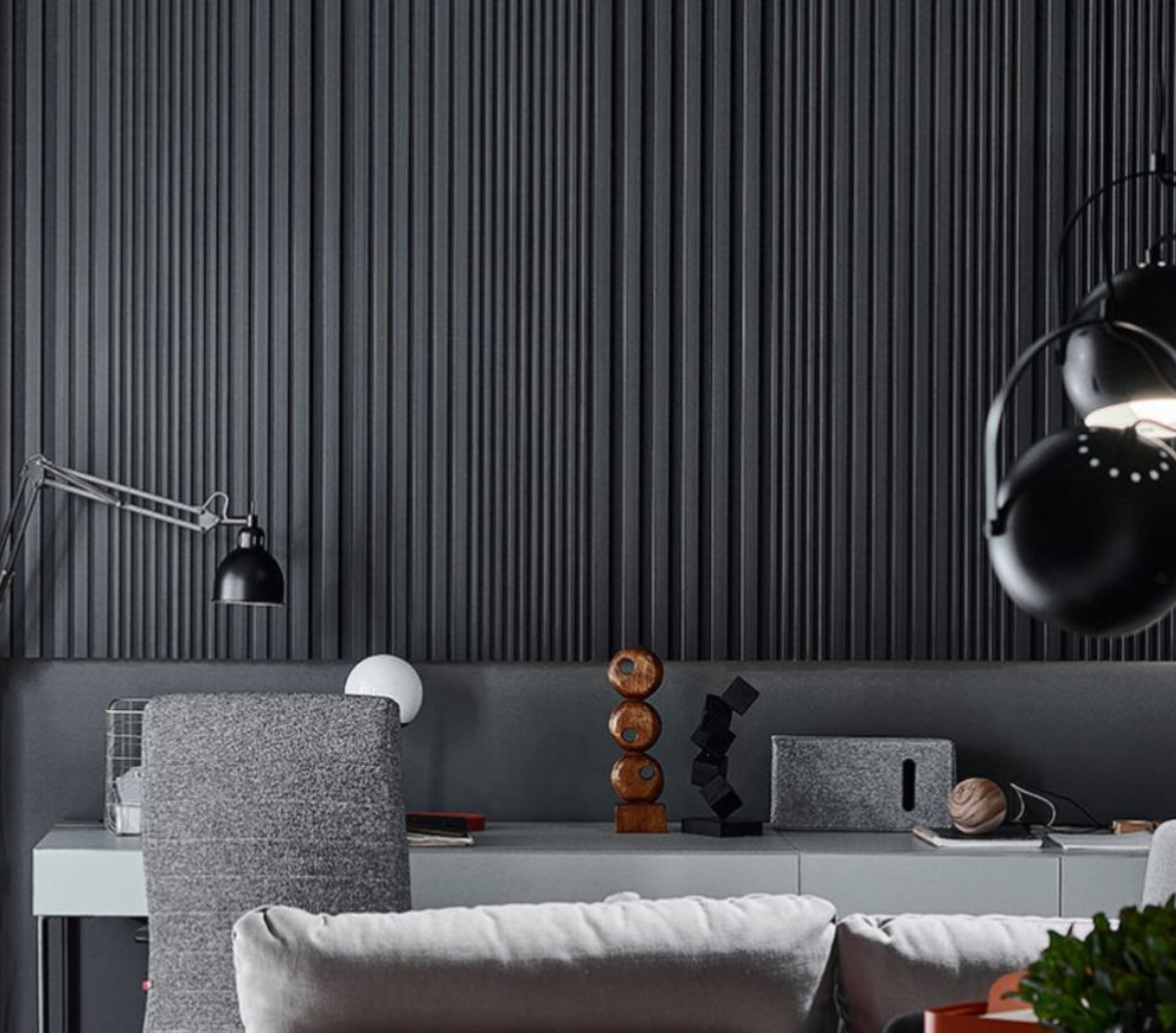 - Panele w antracytowym kolorze świetnie sprawdzą się w kameralnych aranżacjach. Harmonijnie zgrają się z ciemnymi meblami i dodatkami. Zestawiając je z jasnym wyposażeniem, uzyskamy ciekawy kontrast.